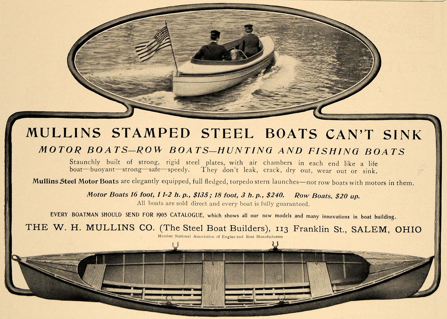This is an original 1905 black and white print ad for motor, row, hunting and fishing boats by The W. H. Mullins Company located at 113 Frankling Street, Salem, Ohio.