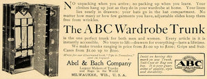 This is an original 1905 black and white print ad for The ABC Wardrobe Trunk by Abel and Back Company located in Milwaukee, Wisconsin. Abel and Bach's trunks were known to be covered in Walrus leather.
