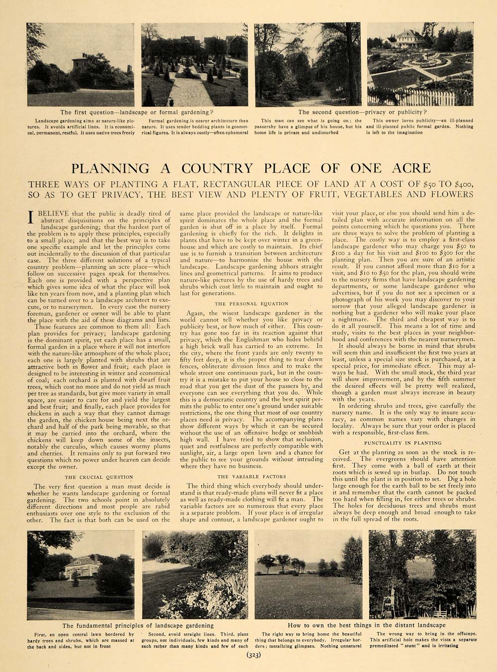 This is an original 1905 1 page article titled, "Planning a Country Place of One Acre", author unknown. The article explains different ways of planing a rectangular piece of land to get privacy, and plenty of fruit, vegetables, and flowers.