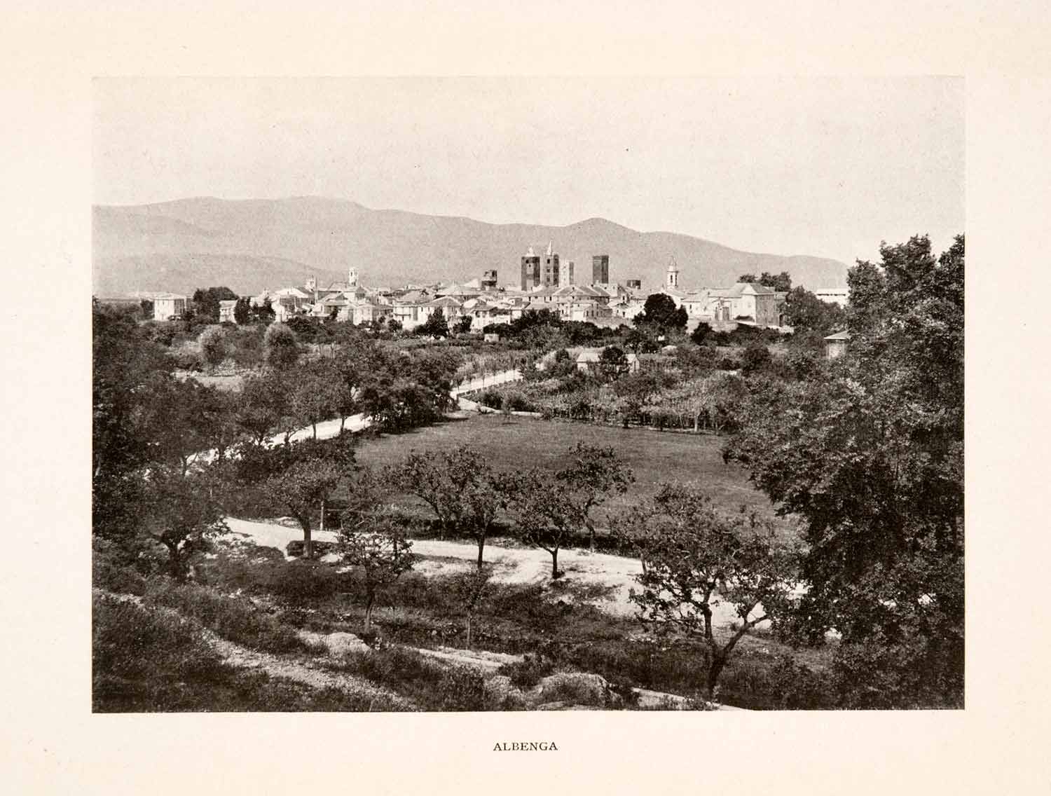 This is an original 1905 black and white halftone print of the commune of Albenga on the Italian Riviera.