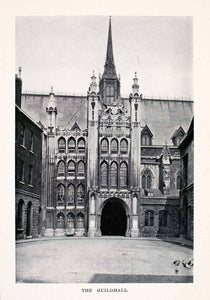 This is an original 1905 black and white halftone print of the Guildhall in London, England. This building has been used as a town hall for several hundred years and is still the ceremonial and administrative center for the city of London. The meaning of the word is a Medieval style great room.