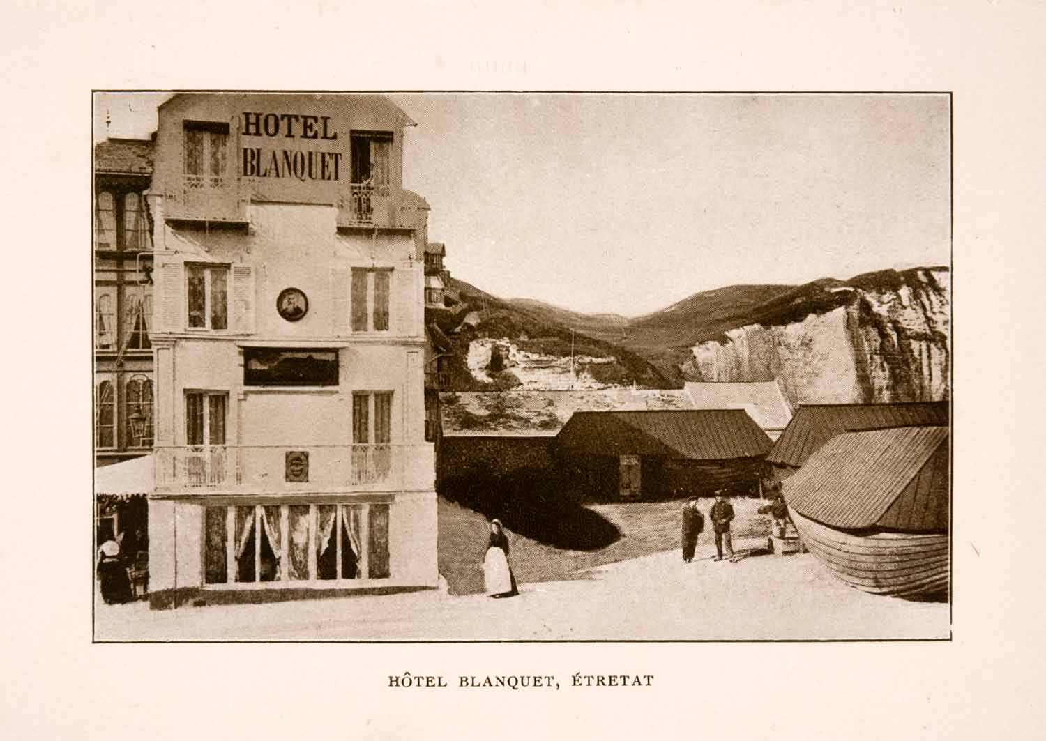 This is an original 1905 black and white halftone print of the famous Hôtel Blanquet, located in Etretat, northern France. It was from this quaint French hotel that artist Claude Monet painted some of his masterpieces during the late 1880s.