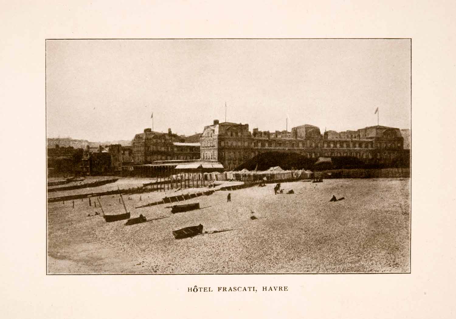 This is an original 1905 black and white halftone print of the famous Hôtel Frascati in Le Havre, France. It was originally designed as a strategic military facility, located near the beach to enable a clear line of fire towards any incoming enemies. Although the entire building was damaged in a fire during 1900, it struggled along for the next half a decade, eventually closing its doors in 1906.