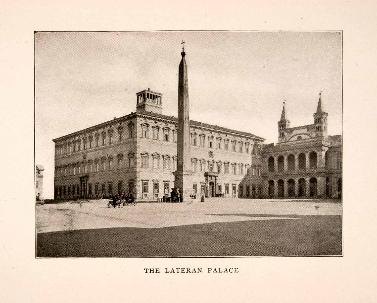 This is an original 1905 black and white halftone print of the Lateran Palace and its Egyptian obelisk located in Capitoline Square in the city of Rome, Italy. Today, the palace is used as offices for papal administrators and is the seat of the Vicariate of Rome.
