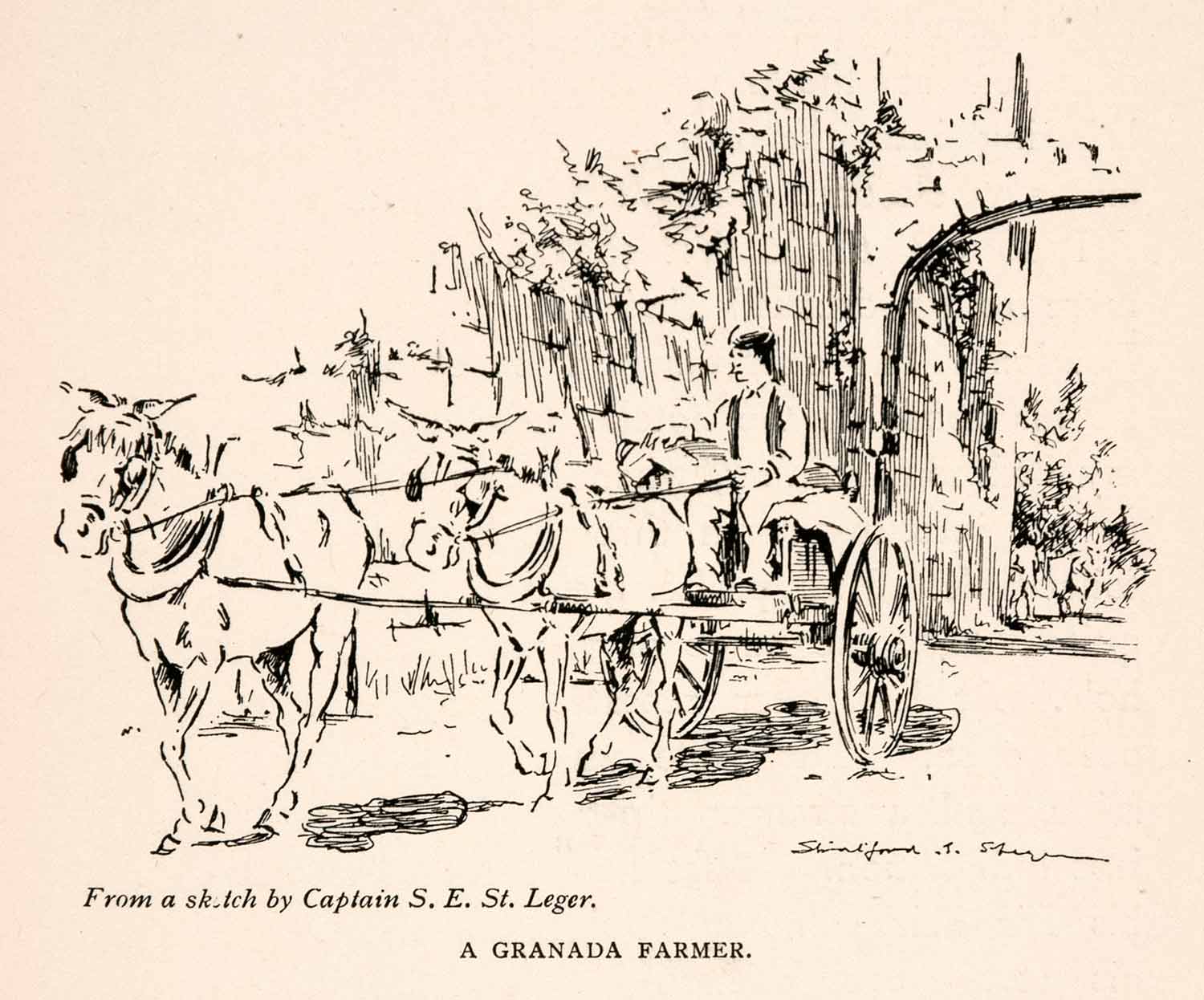 This is an original 1905 black and white lithograph of a farmer of Granada, Spain, featuring artwork by Captain S. E. St. Leger.