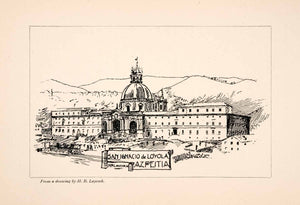This is an original 1905 black and white lithograph of the 18th century basilica of San Ignacio de Loyola in Azpeitia, Spain, featuring artwork by H. B. Laycock. This historic church was erected in a Baroque architectural style by Italian architect Carlo Fontana. The church was officially inaugurated in 1738.