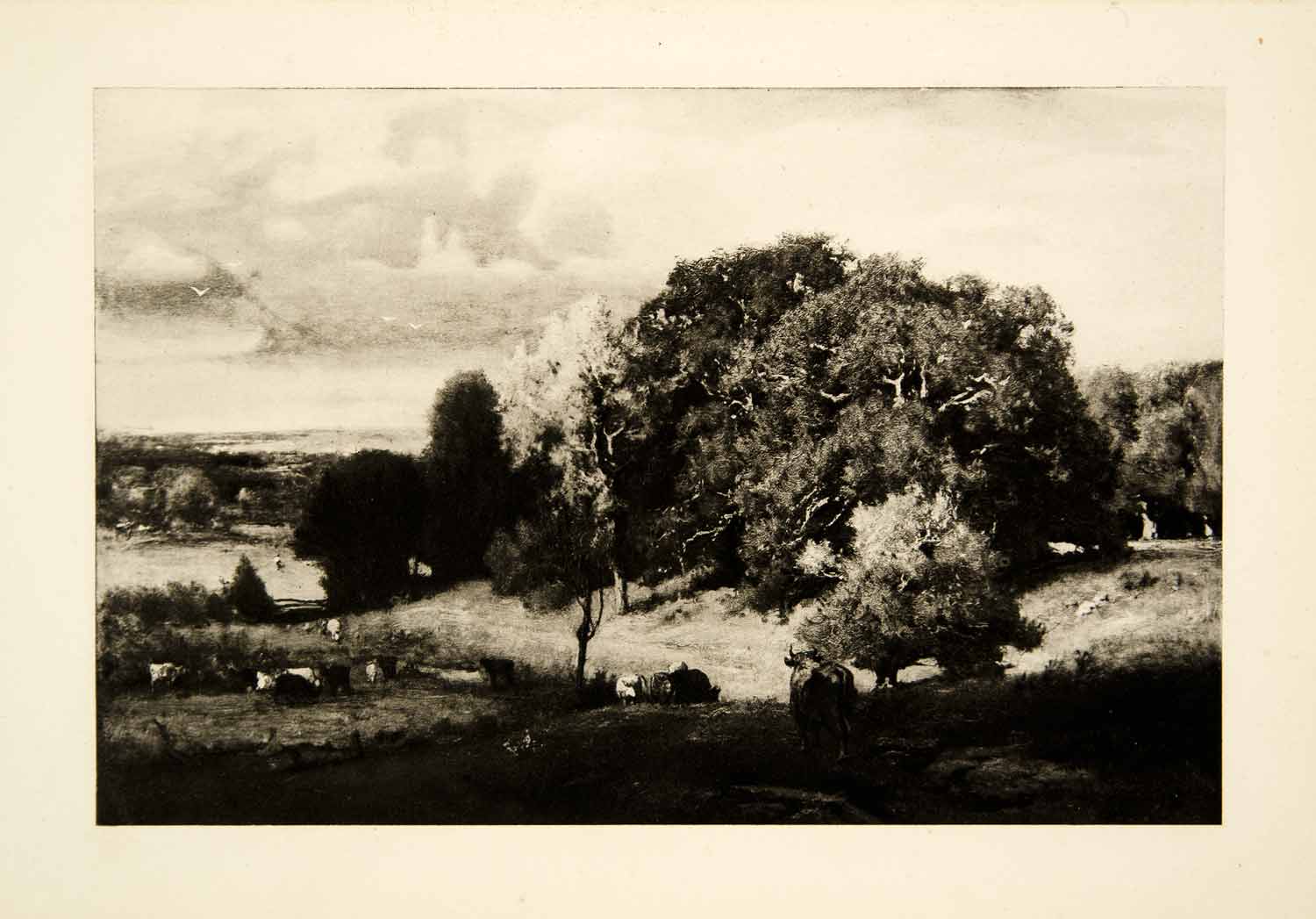 This is an original 1905 black and white photogravure depicting a scene with Autumnal Oak trees by George Inness.