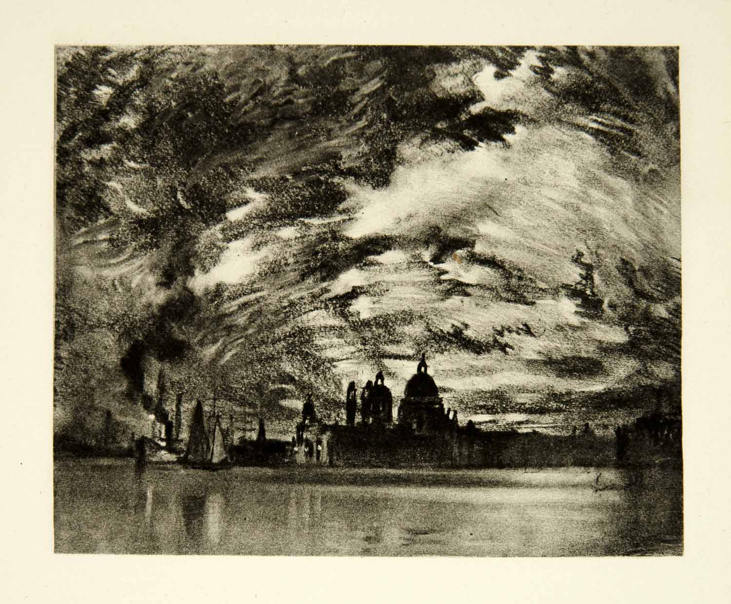 This is an original 1905 black and white photogravure of an illustration by Joseph Pennell of the cityscape of Venice, Italy, at sunset.