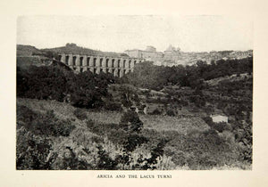 This is an original 1905 black and white halftone print of the Italian town of Aricia and the Lacus Turni located near Rome. The small town was very important in ancient Roman religion and mythology.