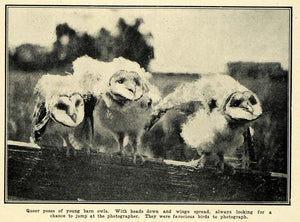 This is an original 1905 halftone print of three fledgling barn owls. Barn owls are one of the most widespread species of owl, and can be seen on all continents besides Antarctica. The birds feet on small mammals and insects.