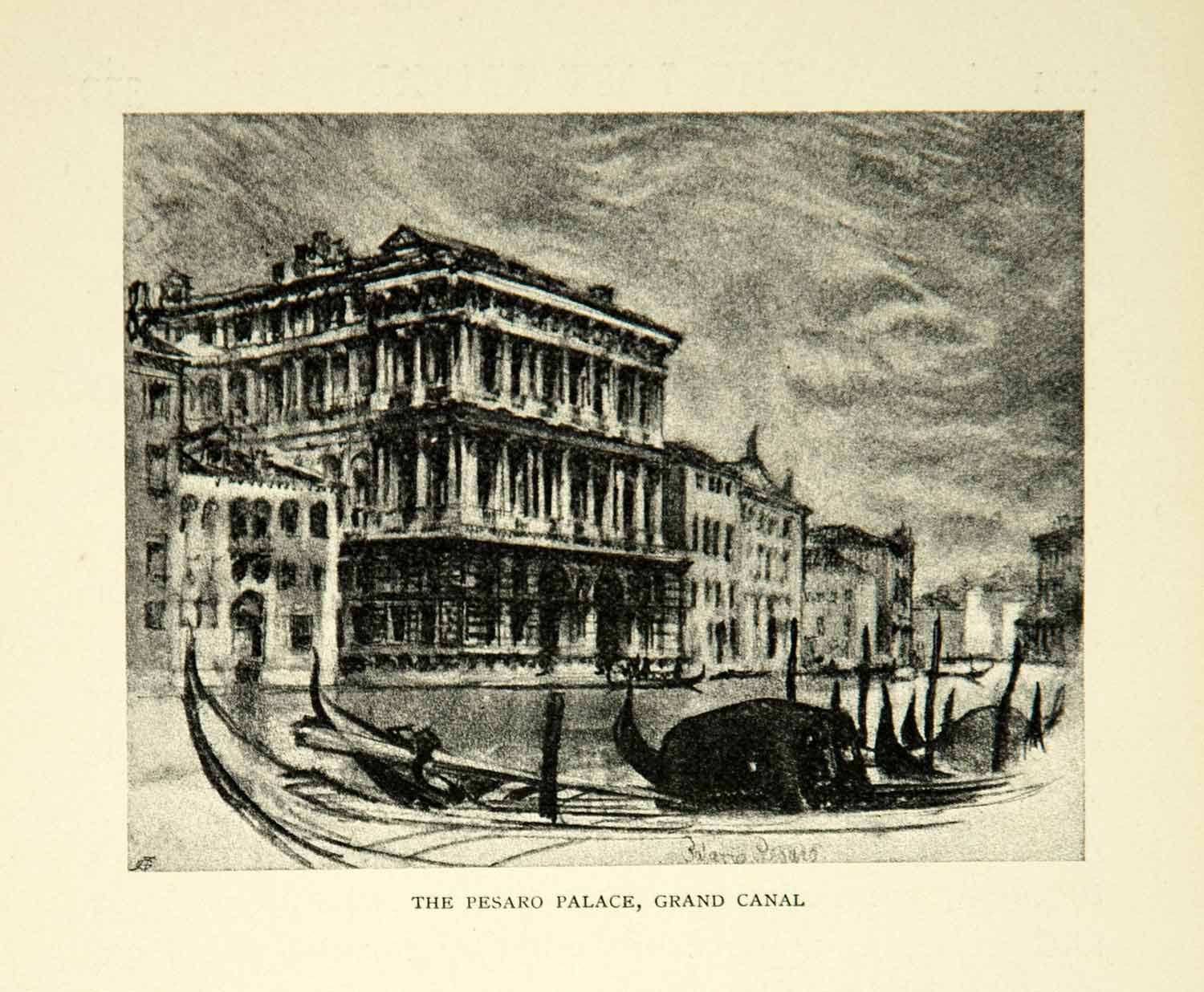 This is an original 1905 monochrome halftone print of an illustration by Joseph Pennell of the Ca' Pesaro in Venice, Italy.