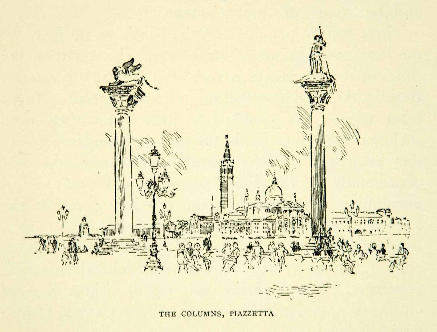 This is an original 1905 monochrome relief line-block print of an illustration by Joseph Pennell of the columns in the Piazza San Marco in Venice, Italy.