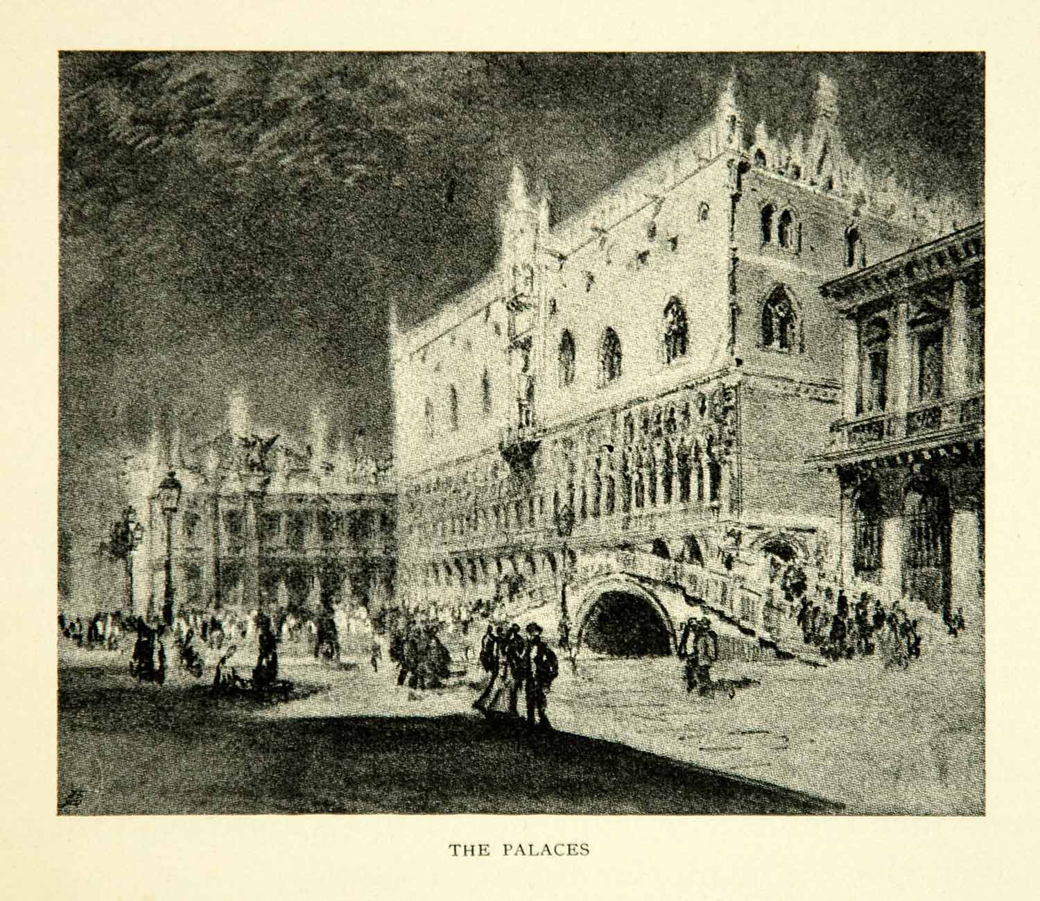 This is an original 1905 monochrome halftone print of an illustration by Joseph Pennell of the Doge's Palace or the Palazzo Ducale in Venice, Italy.
