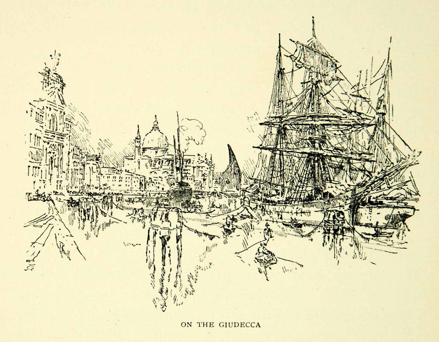 This is an original 1905 black and white halftone print of an illustration by Joseph Pennell of ships on the Giudecca Canal in Venice, Italy.