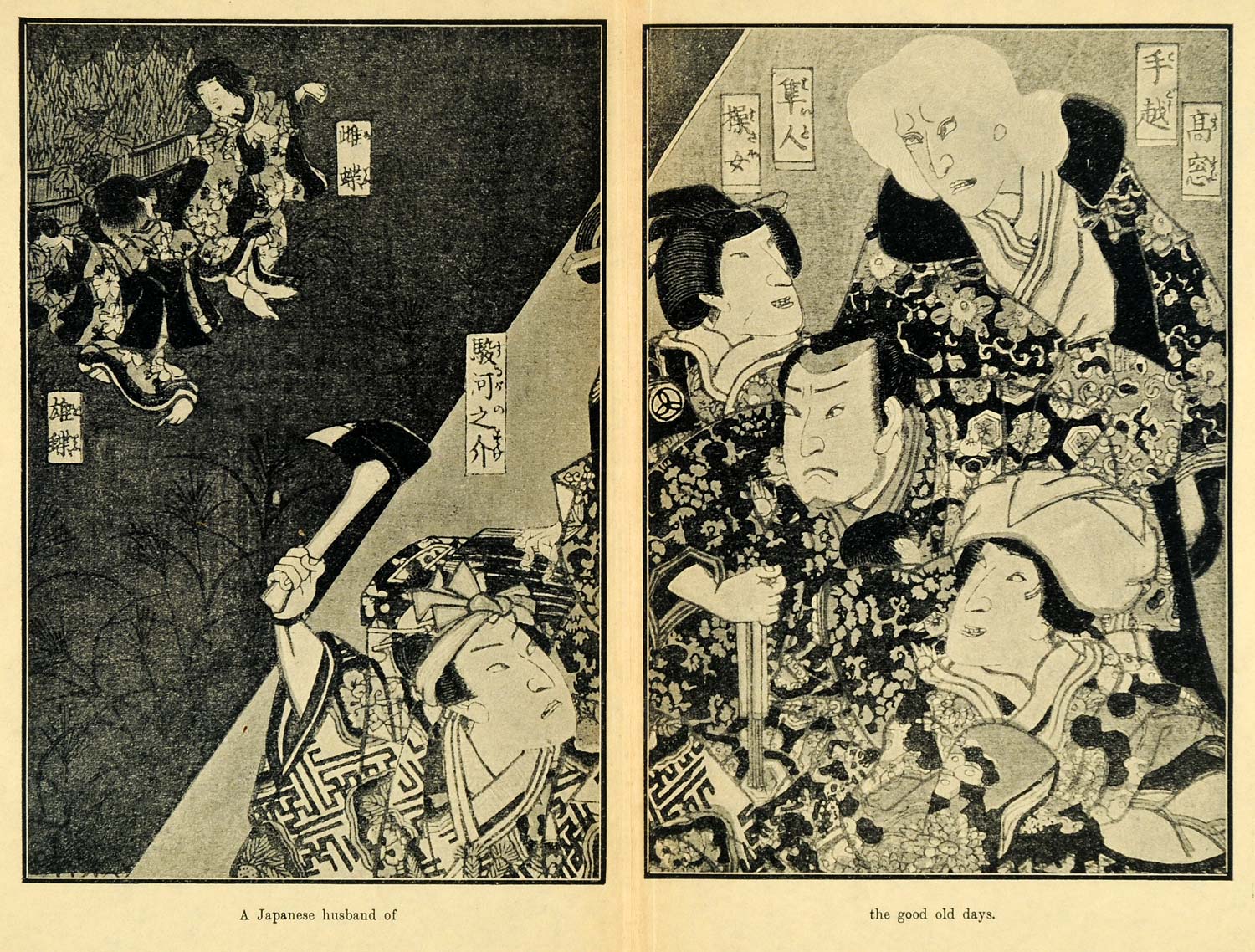 This is an original 1905 halftone print titled, "A Japanese Husband of the Good Old Days." Shown in the illustration are various Japanese men wearing kimonos. Two women are seen in a garden in the background.