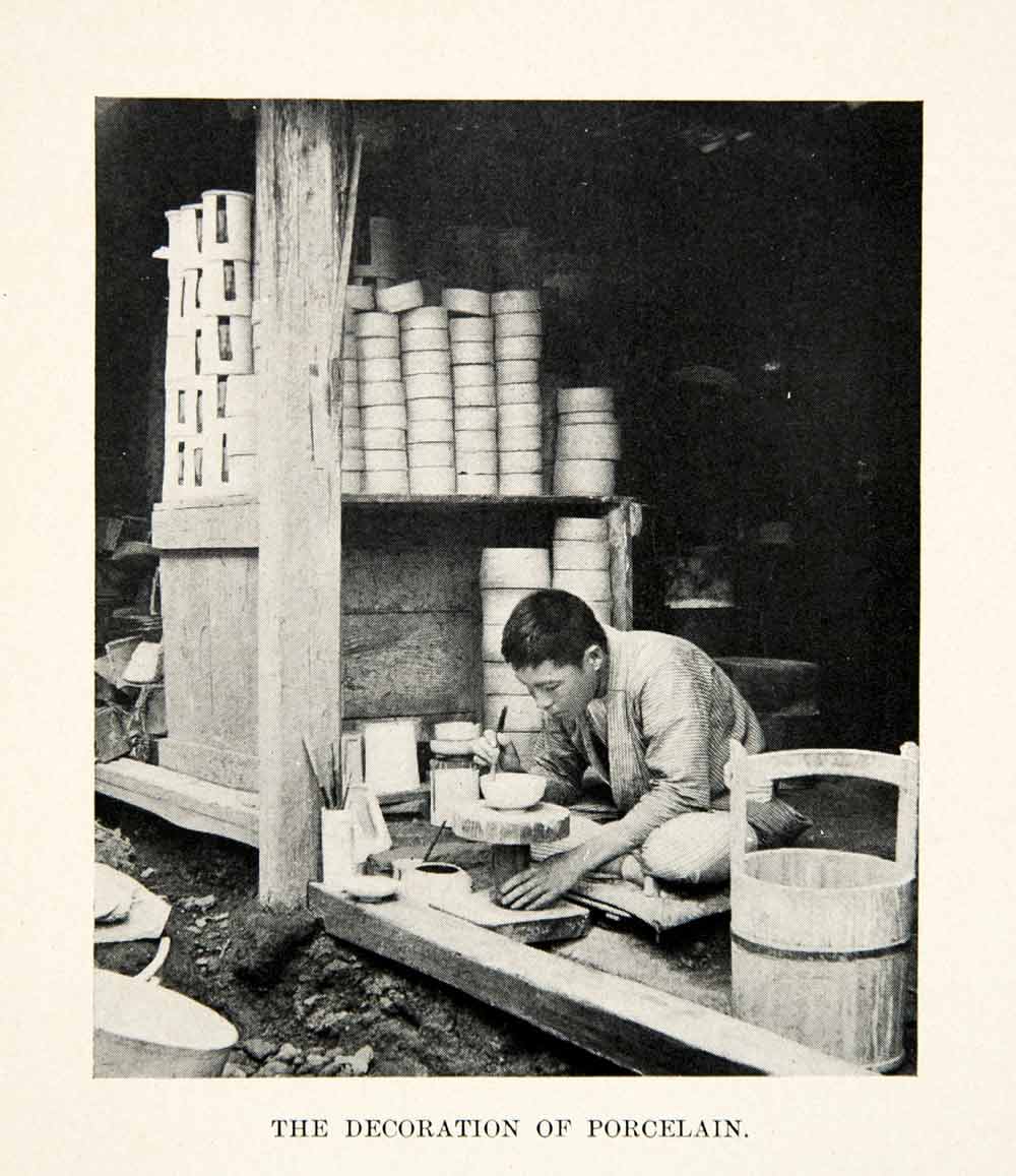 This is an original 1905 monochrome halftone print of a Japanese man decorating porcelain pottery.
