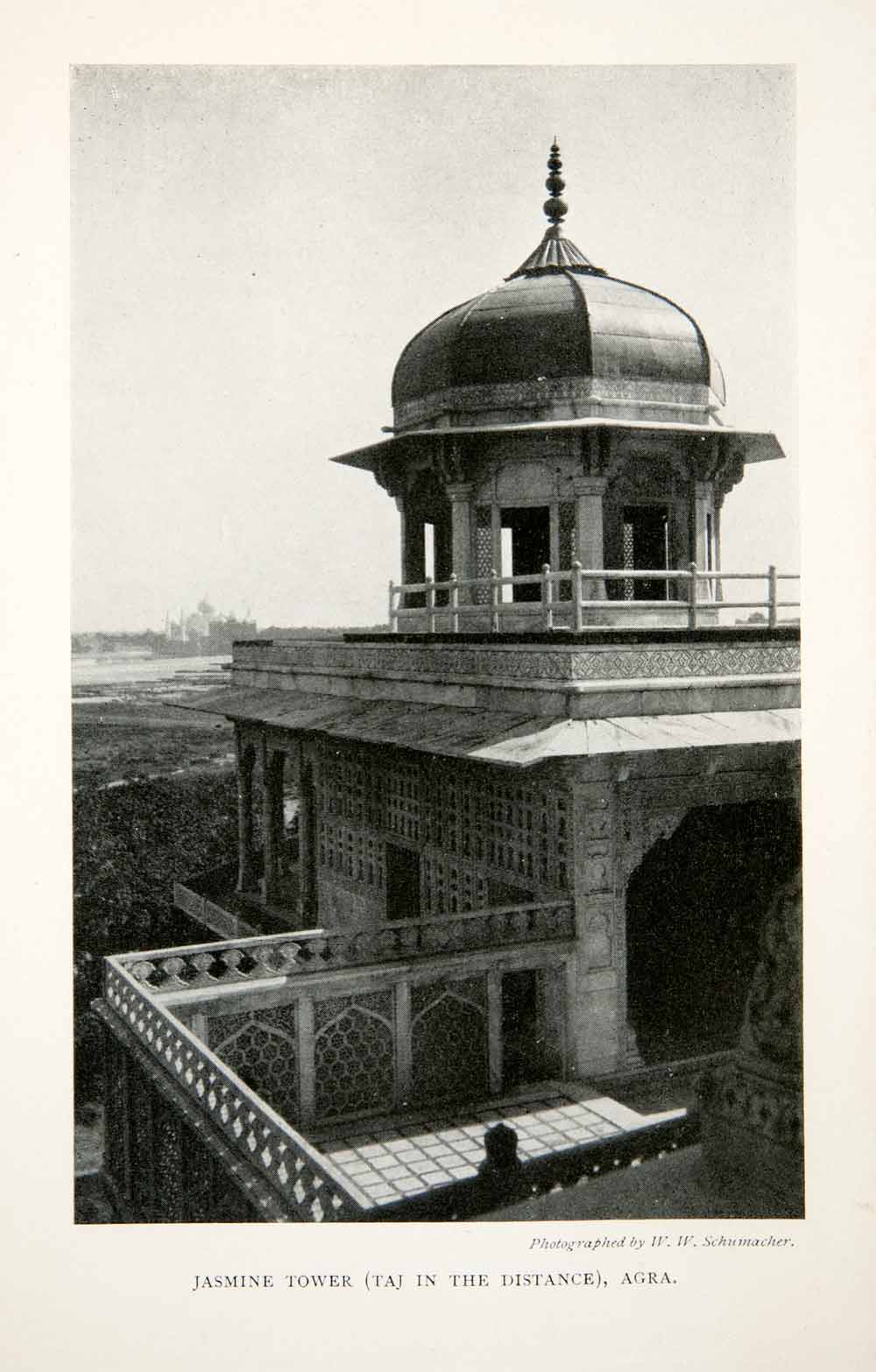 This is an original 1905 black and white halftone print of the Jasmine Tower (Mussaman Burj) in Agra, India. The Taj Mahal is in the distance.