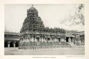 This is an original 1905 black and white halftone print of the Subrahmanya Temple in Tanjore, India.