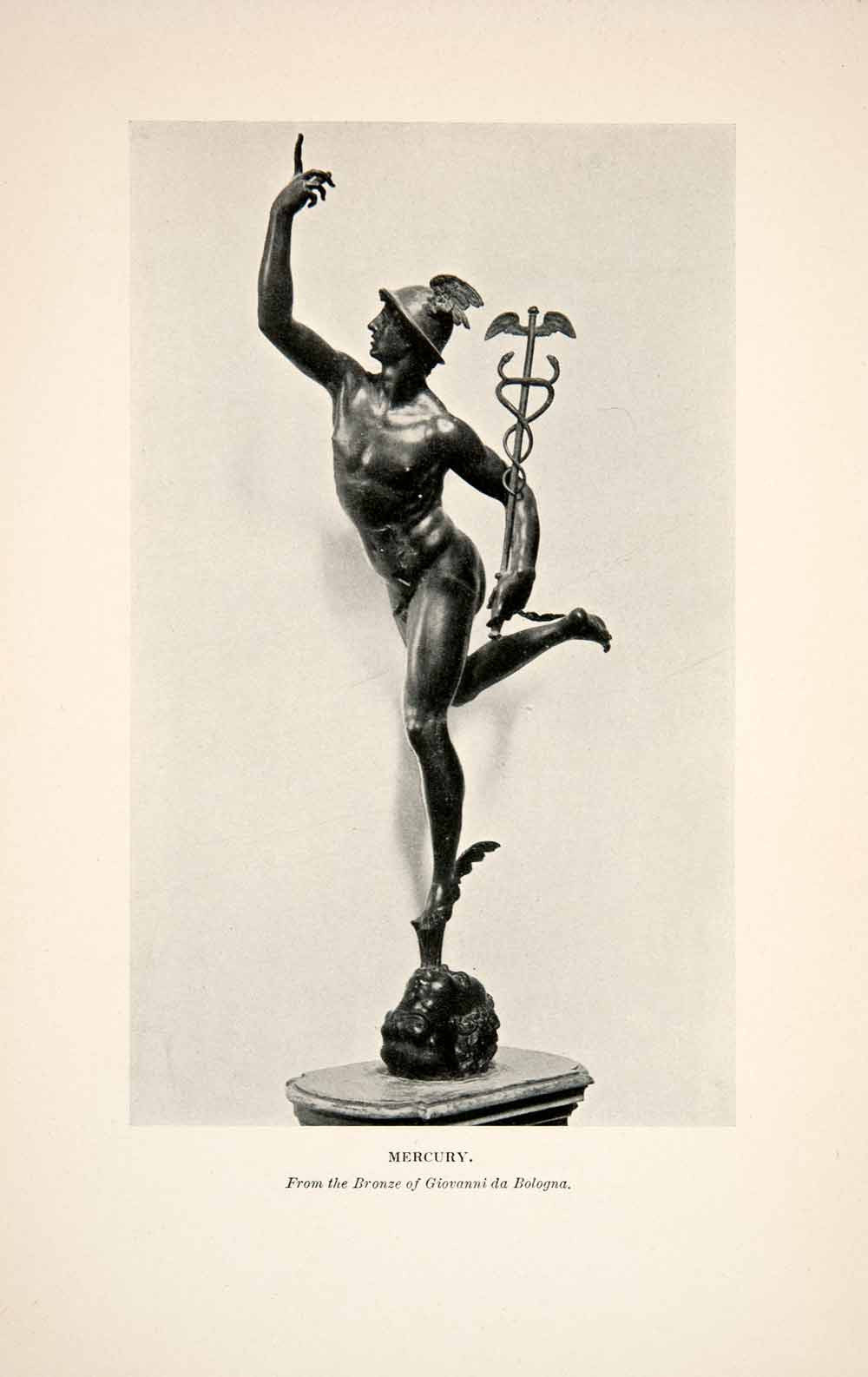 This is an original 1905 black and white halftone print of "Mercury," a bronze statue by Giovanni de Balogna in Florence, Italy.