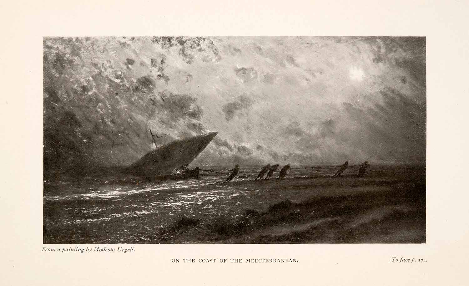 This is an original 1905 halftone print of what appears to be men beaching a sailboat on the coast of the Mediterranean in Spain.