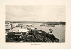 This is an original 1905 black and white halftone print of the harbor of the city of Mombasa which is located in the country of Kenya in eastern Africa. This major port city lies on the Indian Ocean.