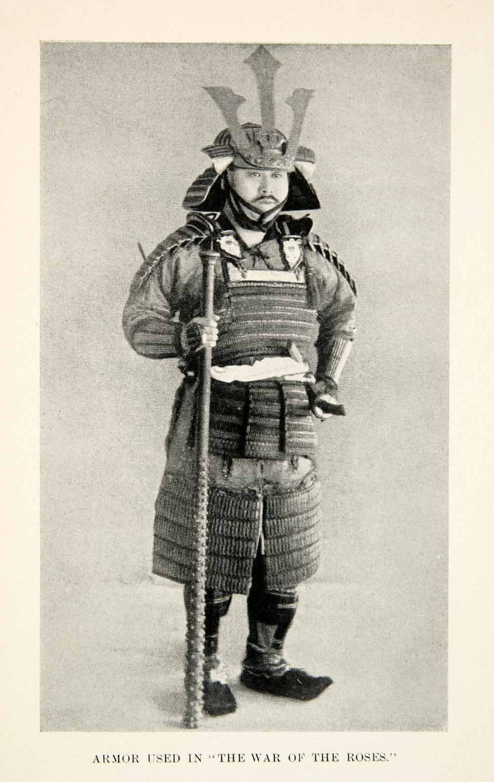 This is an original 1905 monochrome halftone print of armor used in the War of the Roses in Japan.