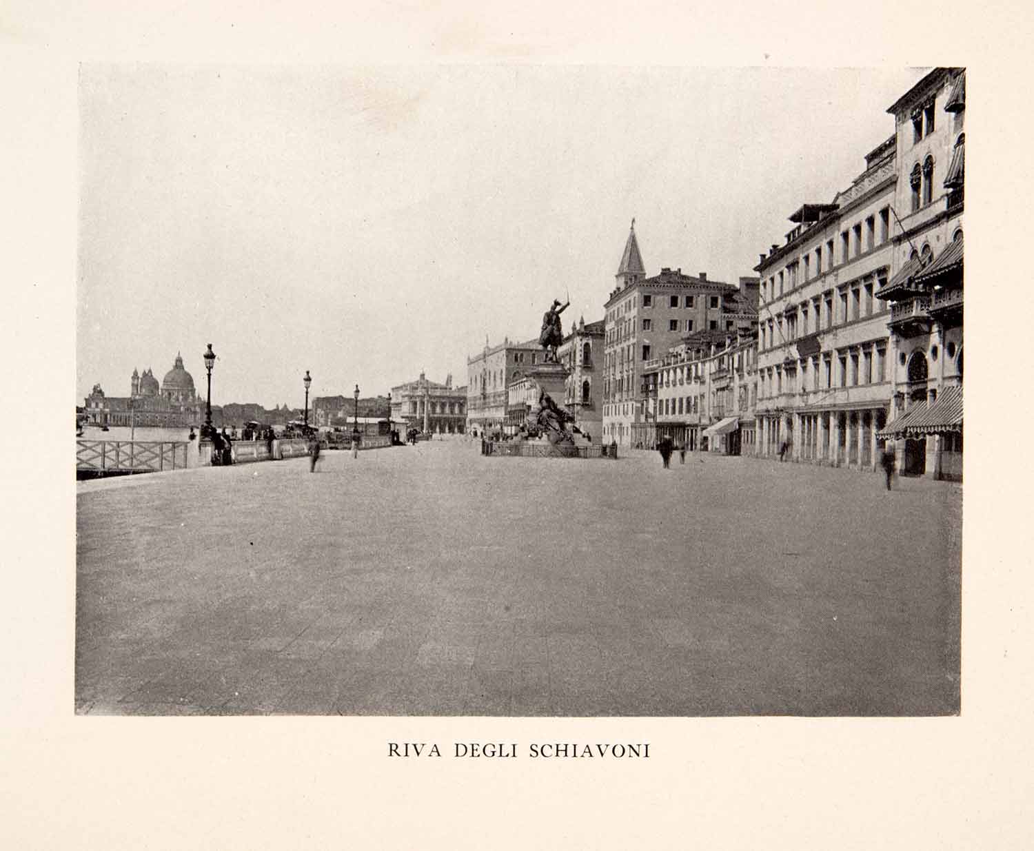 This is an original 1905 black and white halftone print of a view of Venice's main waterfront promenade, the Riva degli Schiavoni.
