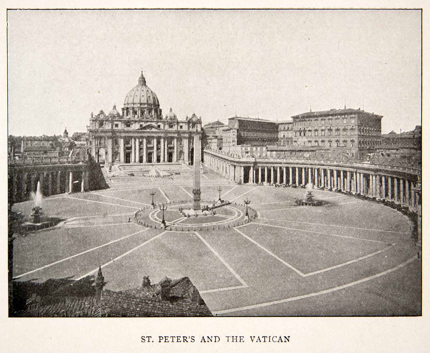 This is an original 1905 black and white halftone print of "St. Peter's and the Vatican," in Rome, Italy.