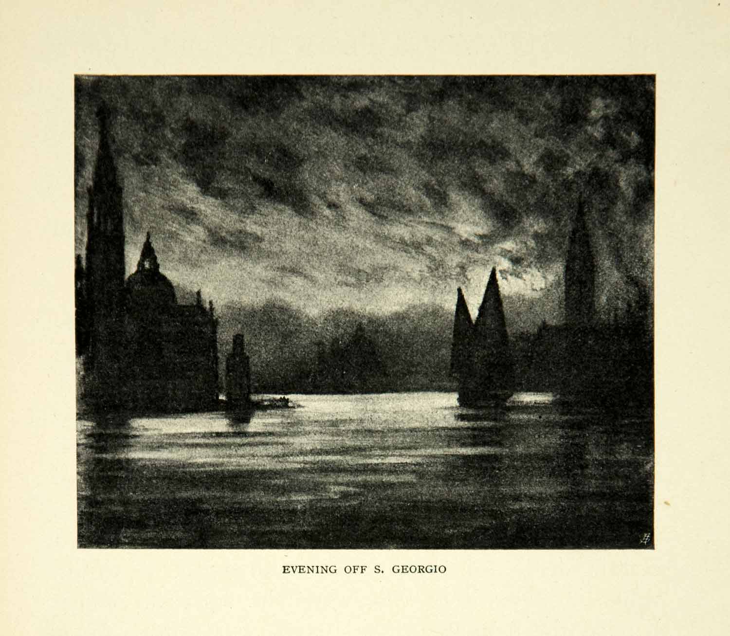 This is an original 1905 monochrome halftone print of an illustration by Joseph Pennell of an evening scene off San Giorgio Maggiore, one of the islands of Venice in Italy.