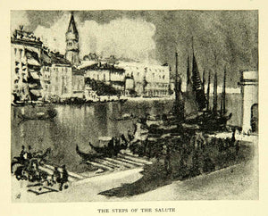 This is an original 1905 black and white halftone print of an illustration by Joseph Pennell of the steps leading up to the Santa Maria Della Salute Church in Venice, Italy.