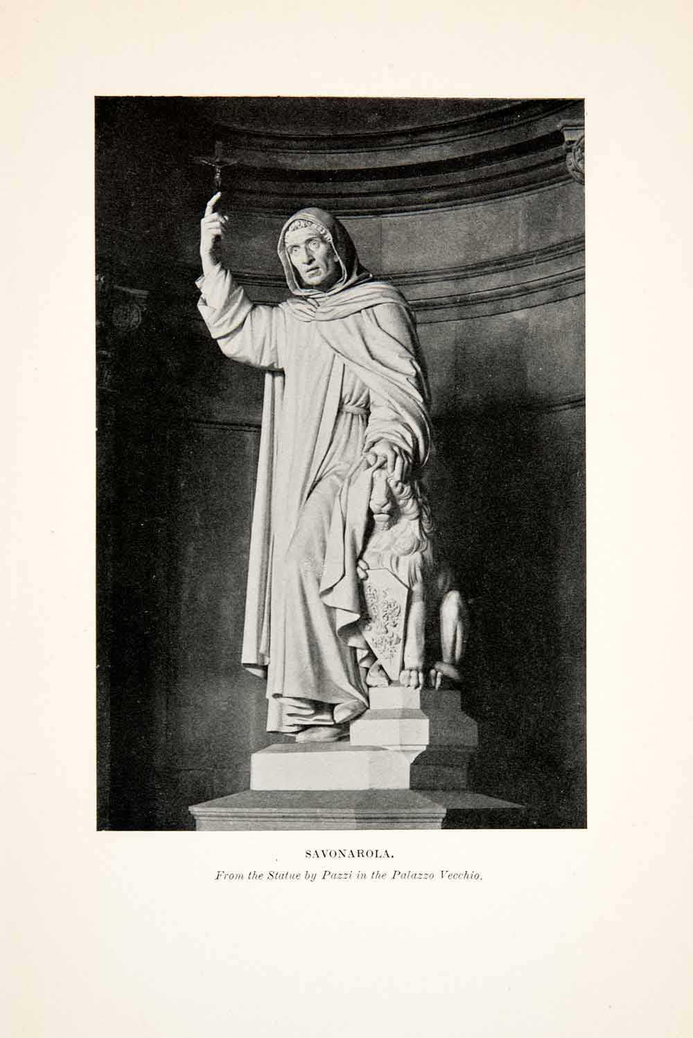 This is an original 1905 black and white halftone print of "Savonarola," a statue in Florence, Italy.