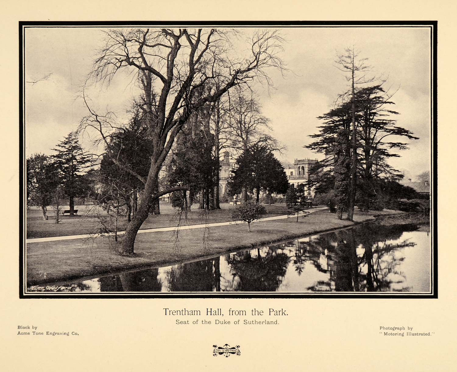 This is an original 1905 halftone print of Trentham Hall, the seat of the Duke of Sutherland in Staffordshire, England, one of the great country houses of England. It was demolished in 1912. Photograph by Motoring Illustrated. Block by Acme Tone Engraving Co.