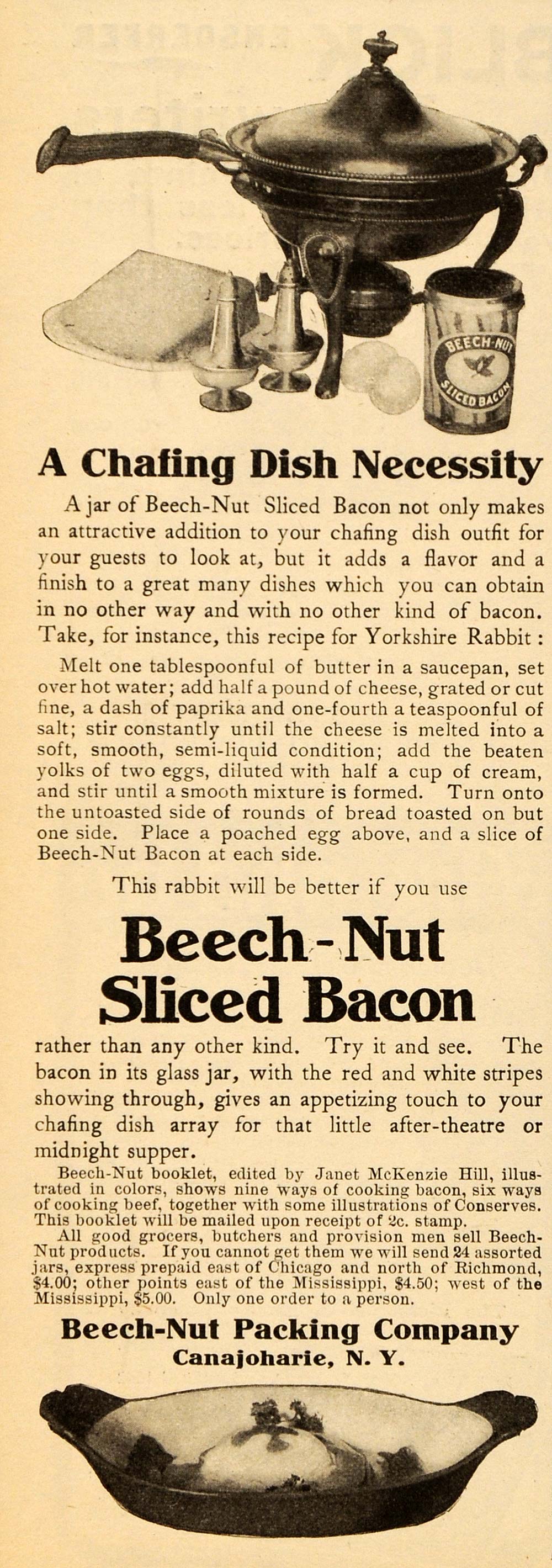 This is an original 1905 black and white print ad for Beech-Nut Sliced Bacon in a jar from the Beech-Nut Packing Company of Canajoharie, N. Y.