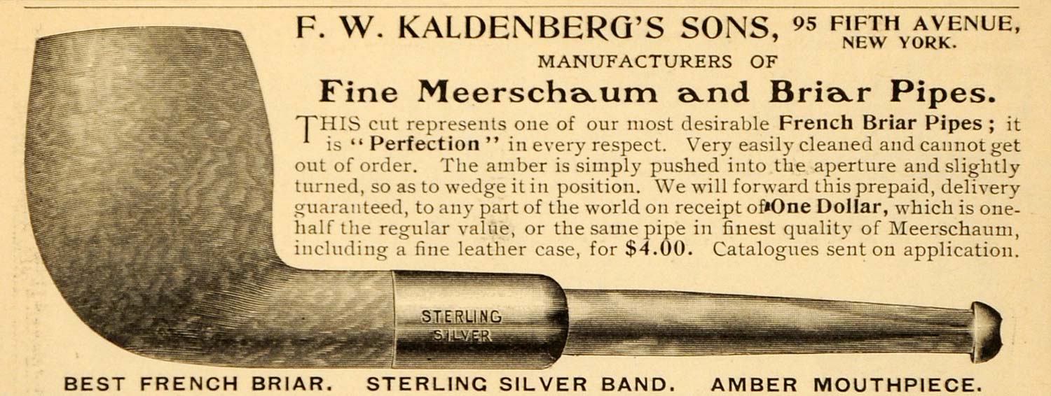 This is an original 1905 black and white print ad for Meerschaum and Briar Pipes from F. W. Kaldenberg's Sons, 95 Fifth Avenue, NYC.