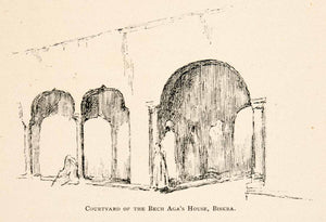 This is an original 1905 black and white in-text wood engraving of "Courtyard of the Bech Aga's House, Biskra," in Algeria.