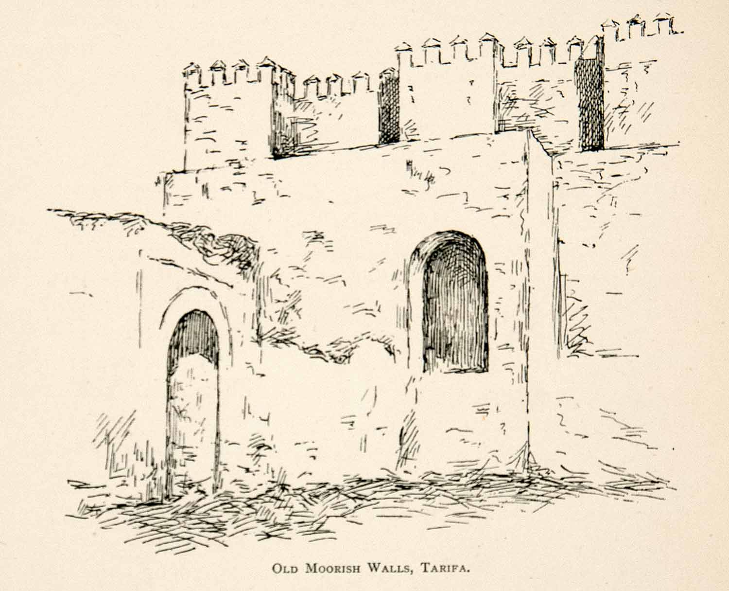 This is an original 1905 black and white in-text wood engraving of "Old Moorish Walls, Tarifa," Spain.