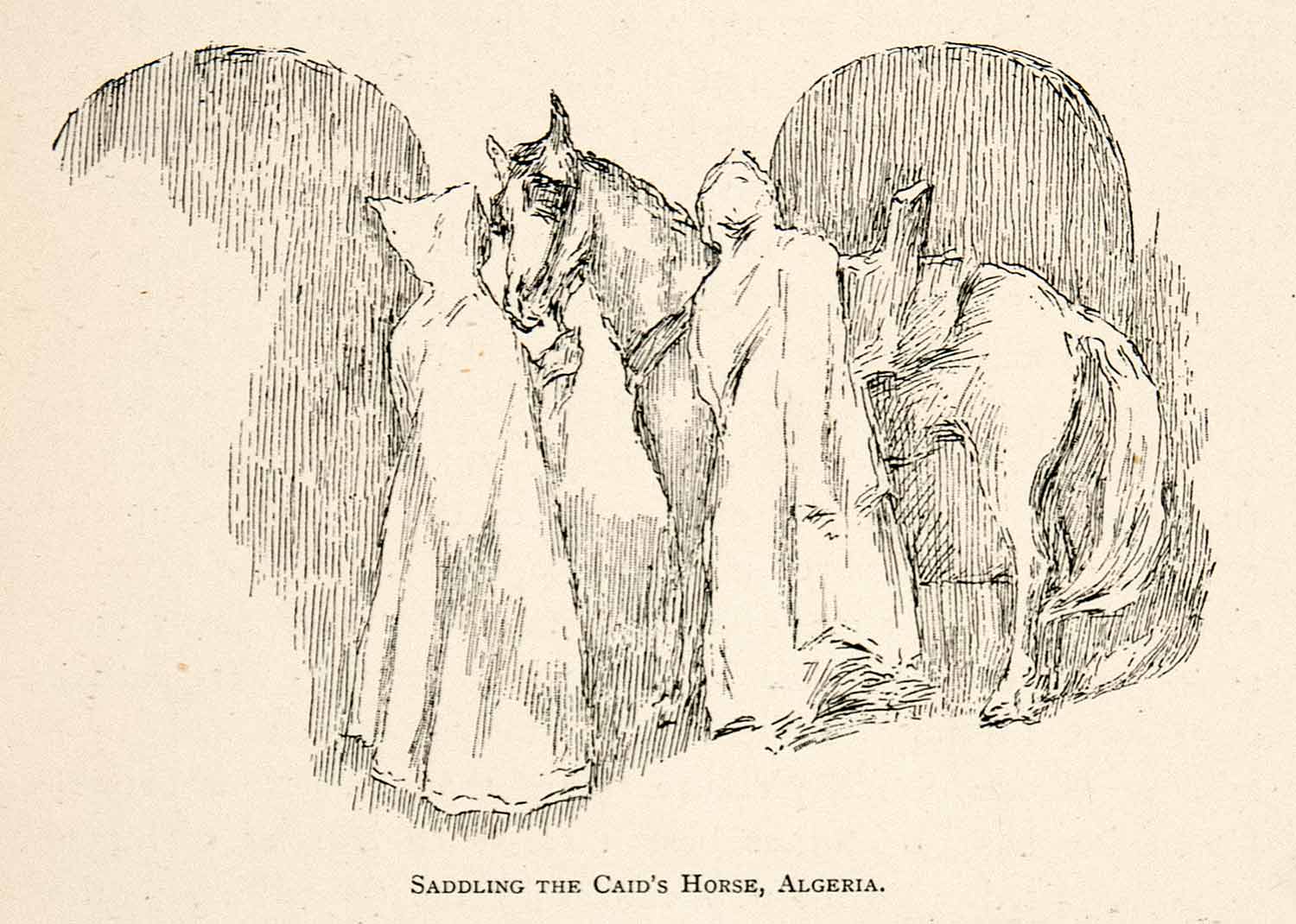 This is an original 1905 black and white in-text wood engraving of "Saddling the Caid's Horse," in Algeria.