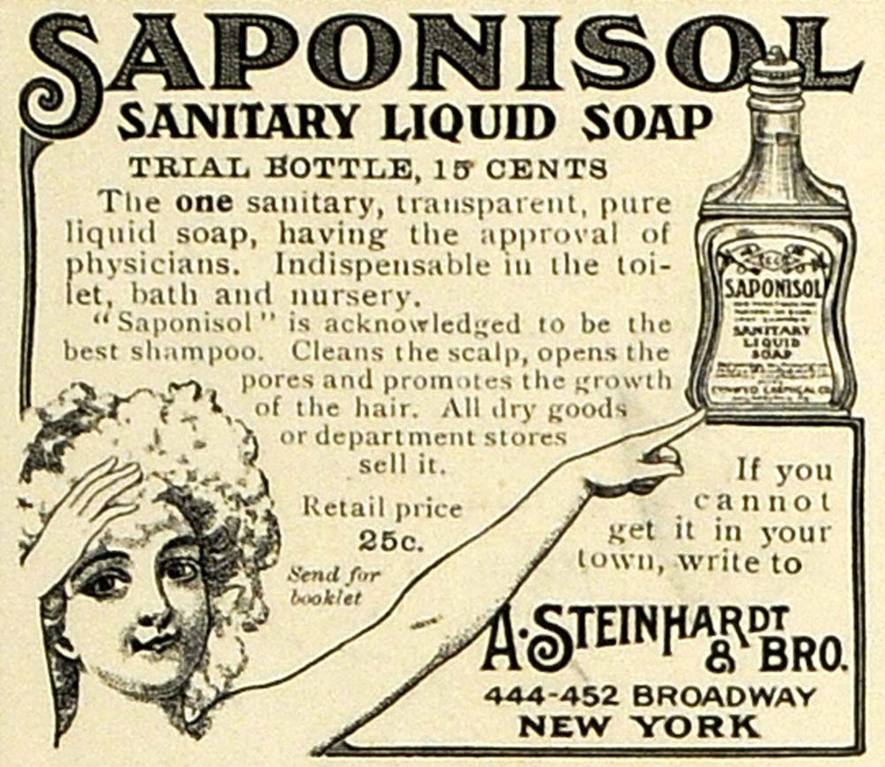 This is a small original 1906 black and white print ad for A. Steinhardt & Bro. of 444 - 452 Broadway in New York; this ad features their Saponisol Sanitary Liquid Soap.