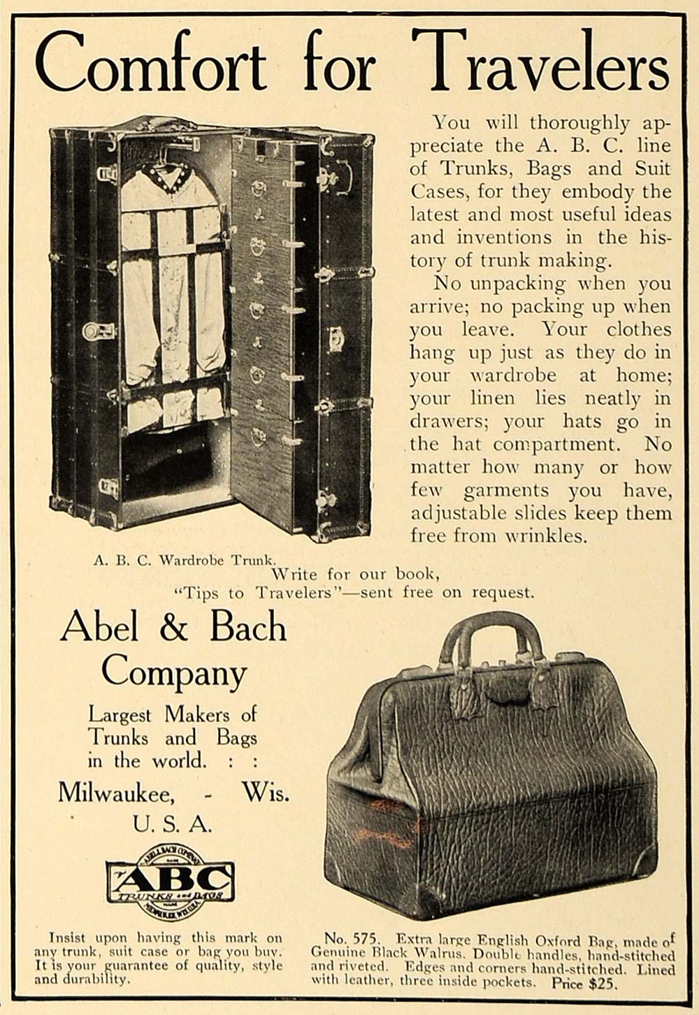This is an original 1906 black and white print ad for the Abel & Bach Company's line of trunks and travel bags. This ad specially features the A.B.C. Wardrobe Trunk, which was perhaps the company's most famous item.