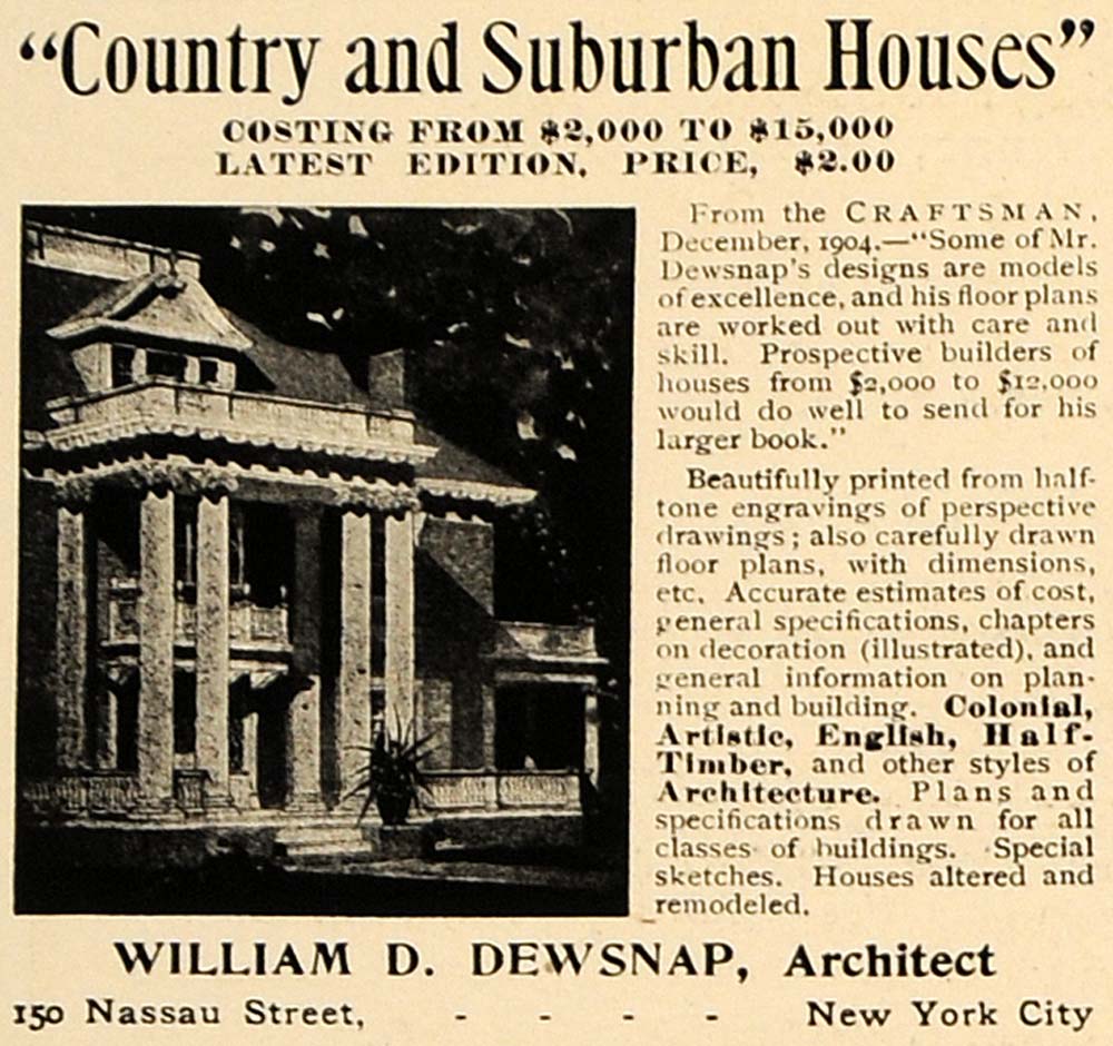 This is an original 1906 black and white print ad for country and suburban homes costing from $2,000 to $15,000 by William D. Dewsnap the architect located at 150 Nassau Street, New York City, New York.