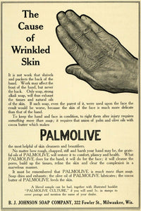 This is an original 1906 black and white print ad for the B. J. Johnson Soap Company of 322 Fowler Street in Milwaukee, Wisconsin; this ad features their Palmolive hand washing soap.