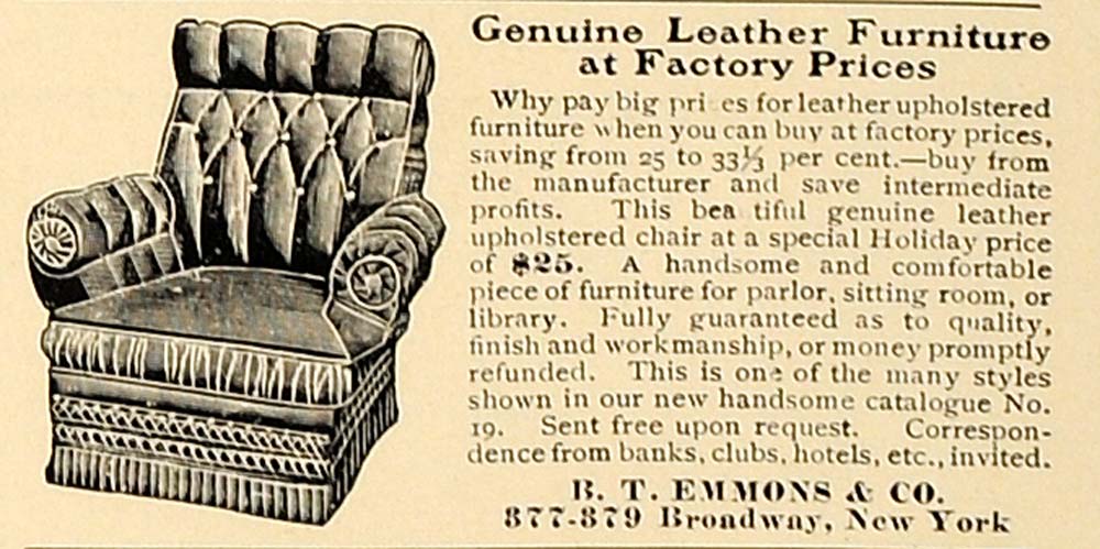 This is an original 1906 black and white print ad for B. T. Emmons and Company. The ad features an image of their genuine leather upholstered chair.