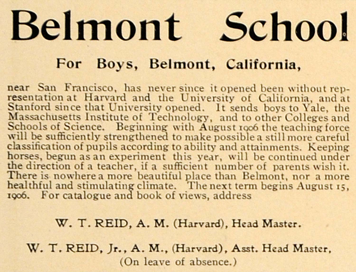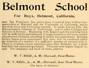 This is an original 1906 black and white print ad for the Belmont School for Boys located in Belmont, California. W. T. Reid, A. M. (Harvard), Head master and W. T. Reid Jr., A. M. (Harvard), Assistant Head Master.