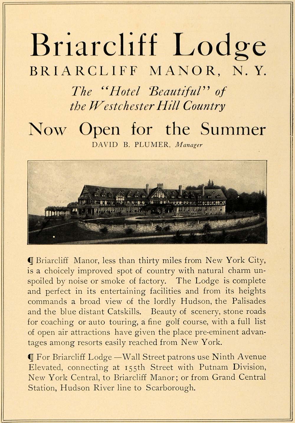 This is an original 1906 black and white print ad for Briarcliff Lodge by David B. Plumer (mager) located in Briarcliff Manor, New York. This lodge is no longer in existence it burned down in 2003 4 days before it was scheduled to be demolished.