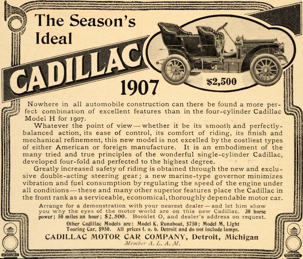 This is an original 1906 black and white print ad for the 1907 four-cylinder Cadillac Model H as well as the Model K Runabout and Model M Light Touring Car by the Cadillac Motor Car Company located in Detroit, Michigan.