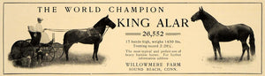 This is an original 1906 black and white print ad for the world champion horse King Alar by Willowmere Farm in Sound Beach, Connecticut.