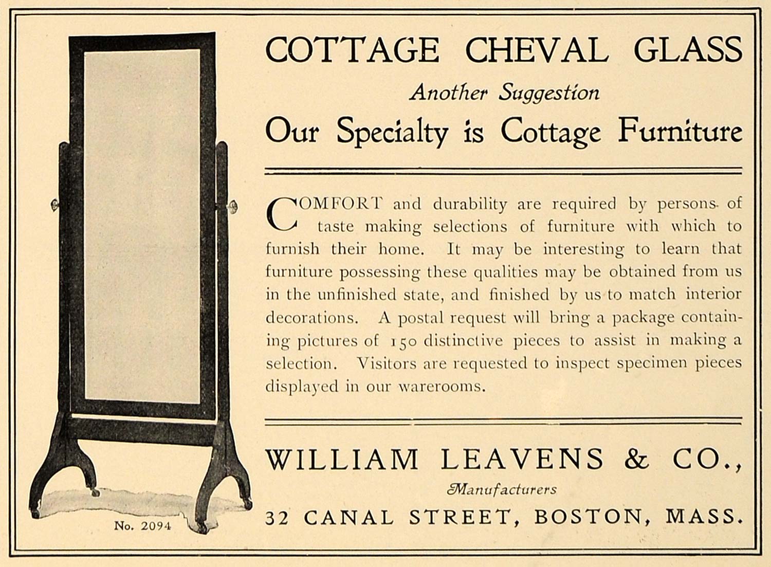 This is an original 1906 black and white print ad for Cottage Cheval Glass No. 2094 by William Leavens and Company located at 32 Canal Street, Boston, Massachusetts.