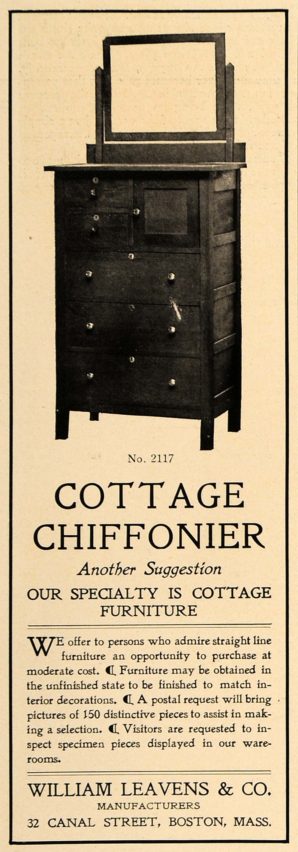 This is an original 1906 black and white print ad for a Cottage Chiffonier (No. 2117) by William Leavens and Company located at 32 Canal Street, Boston, Massachusetts.