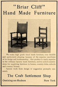 This is an original 1906 black and white print ad promoting the Briar Cliff hand made furniture from Craft Settlement Shop located in Ossining-on-Hudson, New York.