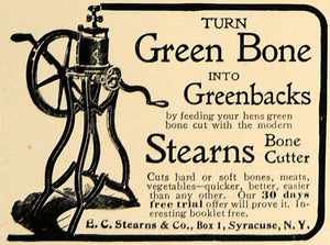This is an original 1906 black and white print ad for the Stearns Bone Cutter by E. C. Stearns and Company located in Syracuse, New York.
